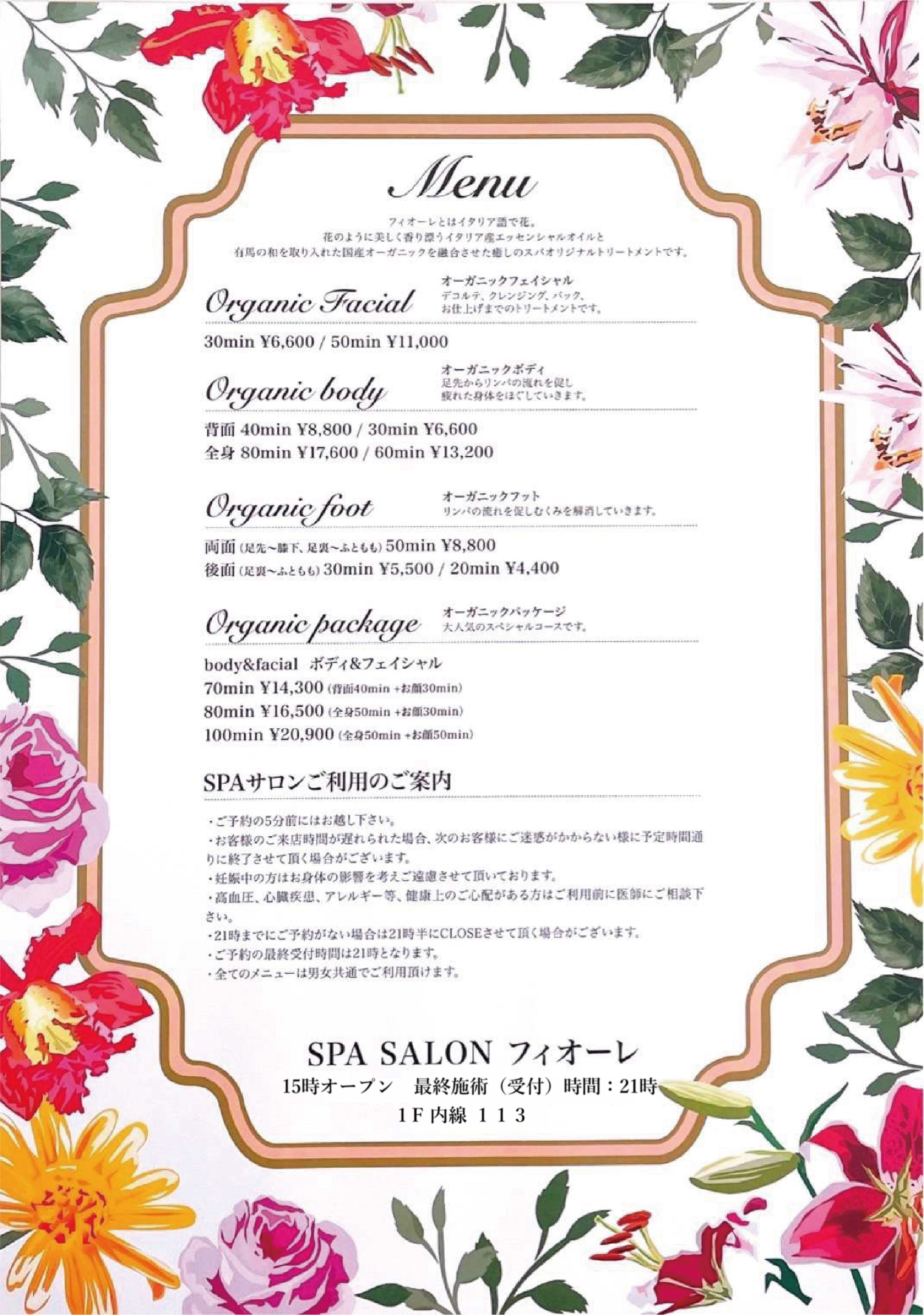・100分以上のメニューをご利用のお客様は最終受付21時にはお入りください。